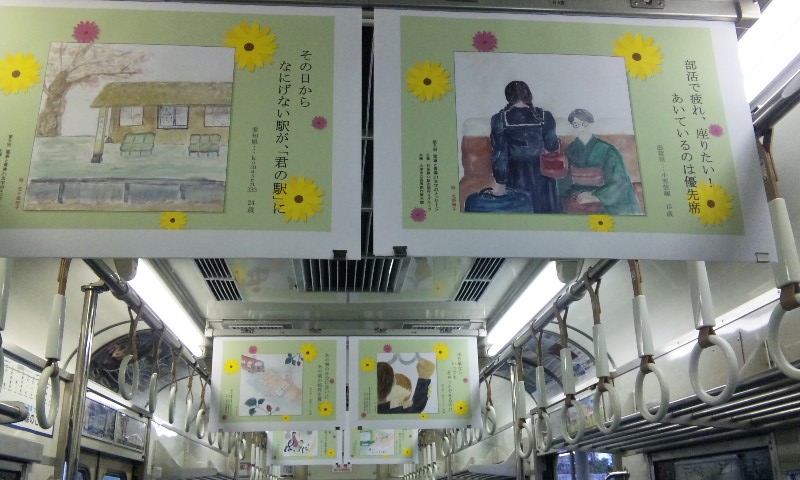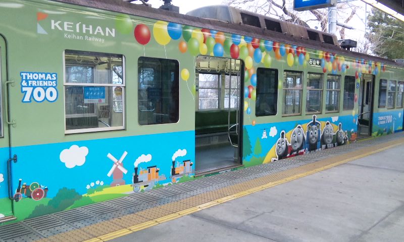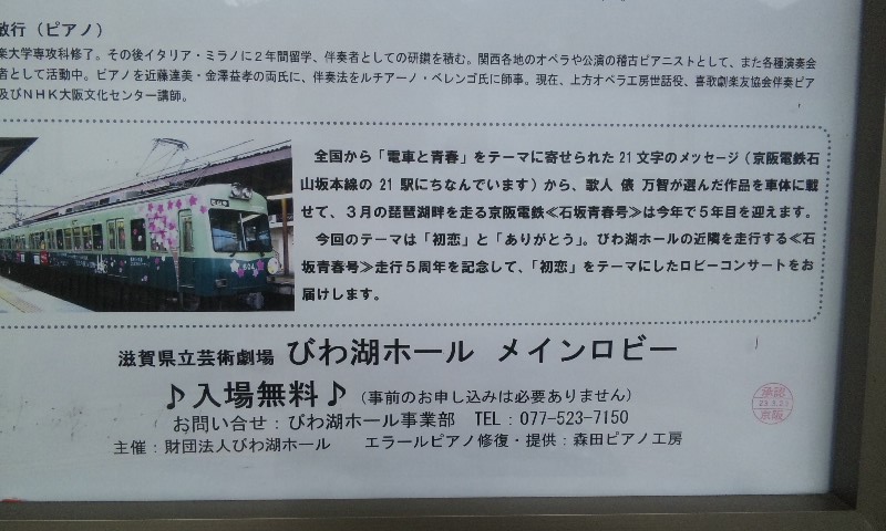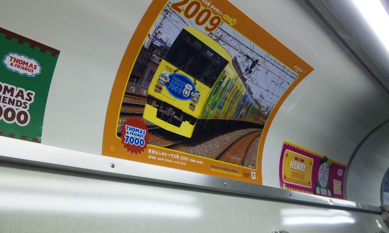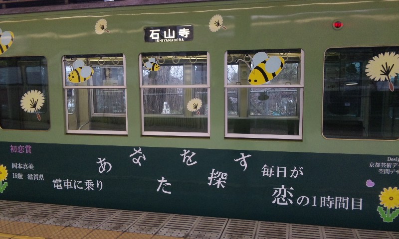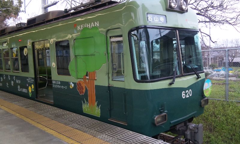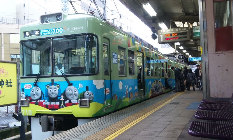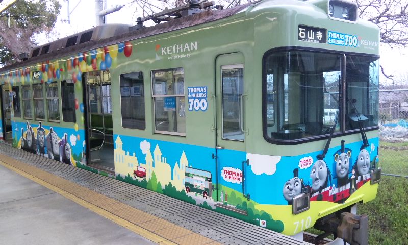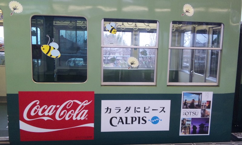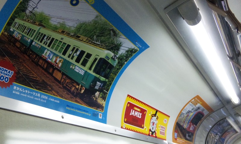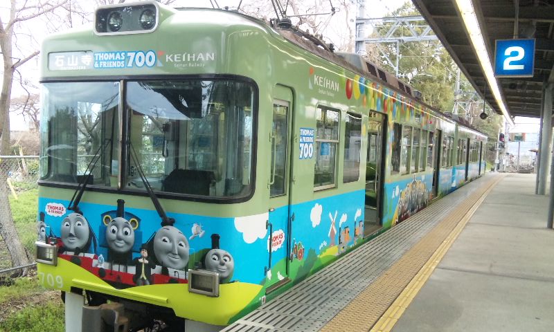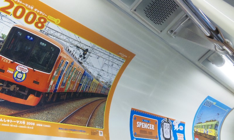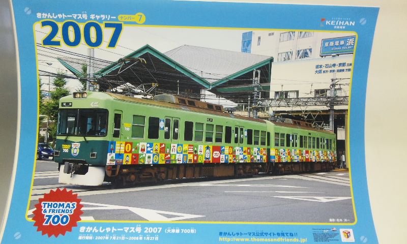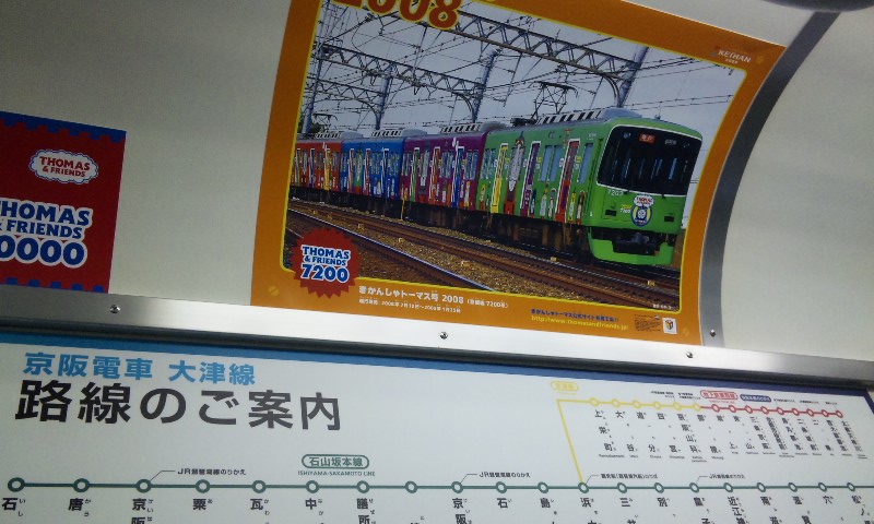 春到来!ってことで、3車両が新たなラッピングを施して登場しました。 1車両ずつ、ご紹介していきますね! ★黒澤明展ラッピング電車★ 611F(611-612)に施されています。 もともと、叡山ケーブルのラッピングを施していたのですが、 その上に、黒澤明展のラッピングを施した、という感じでしょうか。 HMもちゃんと掲出されています。 背景の薄いやつ、これは大津市の市章・・・ってなんでなんだろう? 謎。 こんな感じで、荷物棚の上に写真が掲載されています。 通常の広告もあるので、結構目立ちにくい・・・かも?? 実は、この展示を比叡山の山中にある「延暦寺」で行うんだとか。 それのPRを比叡山鉄道(ケーブル)と共同で担っており、 それでこのラッピング電車に上乗せする形でラッピングしたと、そういう経緯のようです。 納得。 ★石坂青春号★ 坂本駅で見つけた、このポスター。 この電車、ポスターを見る前に、見かけていたので、 ボケーっと、坂本駅で待ってました、あの寒々しいベンチで!! で、これですw やってきたのは、619F(619-620)。 しかし、今回も落書きが激しい・・・(違う!!) 春の装いを見せるこのラッピング。 そして、俵万智さんの選んだメッセージがラッピングされています。 なんと今回のラッピングはスポンサーが付いてます! 大企業ゆえ、広告料は結構いただいてるのかな?京阪電車さん!!ww 車内はこんな感じ。 いつもの車内と変わんないじゃん!と言う声もあるかな? ちょっと気づいたかな? ポイントは、「中吊り広告」。 こんな感じで、俵万智さんらの紹介や、メッセージの紹介も載せられています! 結構な数があるので、見ごたえ十分。 改めて、全景です。 最後に、HM、どアップで。 ★きかんしゃトーマス号2011(大津線ver.)★ HMありませんが、今回もド派手なラッピングです! 今回ラッピングを受けたのは、709F(709-710)。 2両目(石山寺方)の「ほぼ全景」ですw 車内は、またもや普通の車内!? なんてことはなく、 歴代の「トーマス号」が、京阪線・大津線にかかわらず紹介されています。 車端部の壁は、こんな感じに。 今回の「トーマス号」、京阪線は10000系が務めますが・・・ 10000系が務めるのは、2006年以来、5年ぶりとなります。 そして、大津線の「トーマス号」。 今年は700形でしたが、これは2007年以来、4年ぶりの抜擢です。 1両目(坂本方)の「ほぼ全景」w 言い忘れてましたが、形式番号「709」「710」は、電車の前面左下にちょこんと書いてます。 流石に分かりづらいです、京阪さん・・・ てなわけで、今回は「春の新作ラッピング車」3車両をお届けしました!