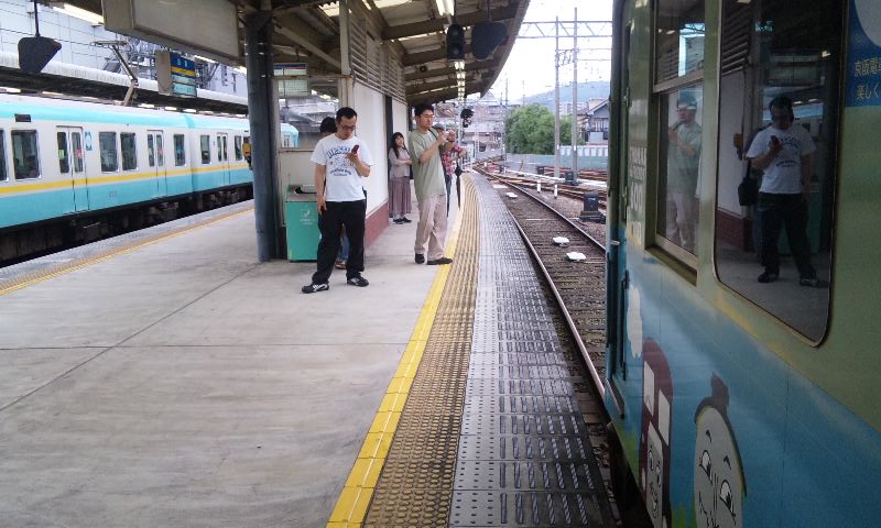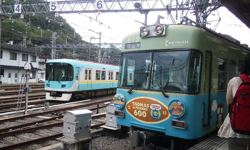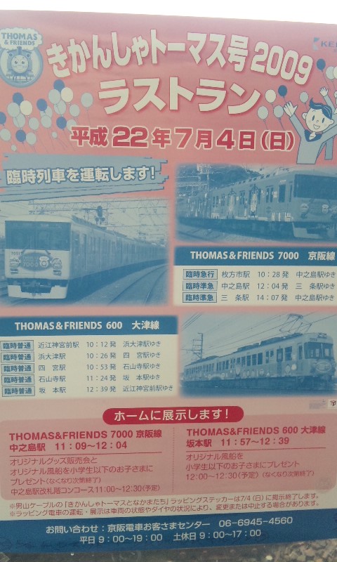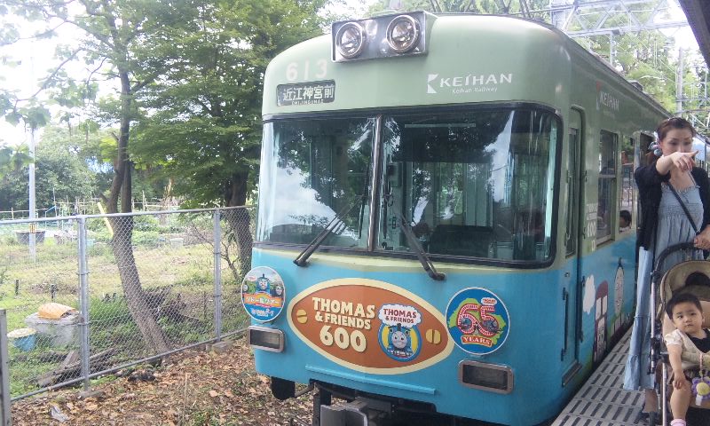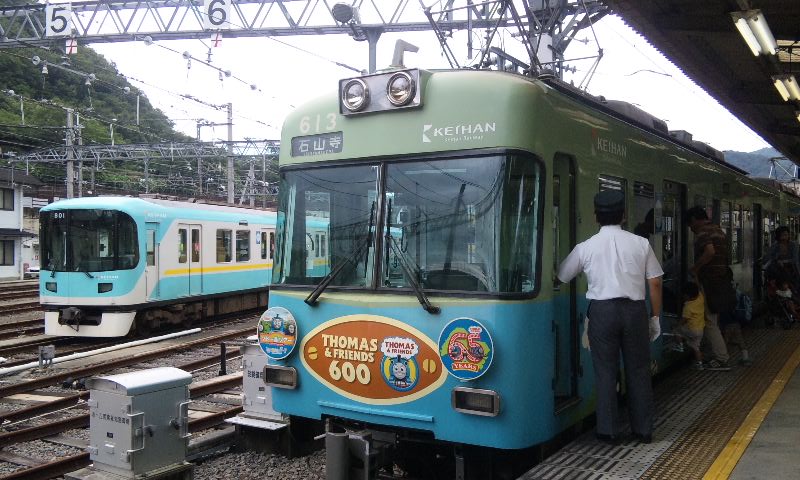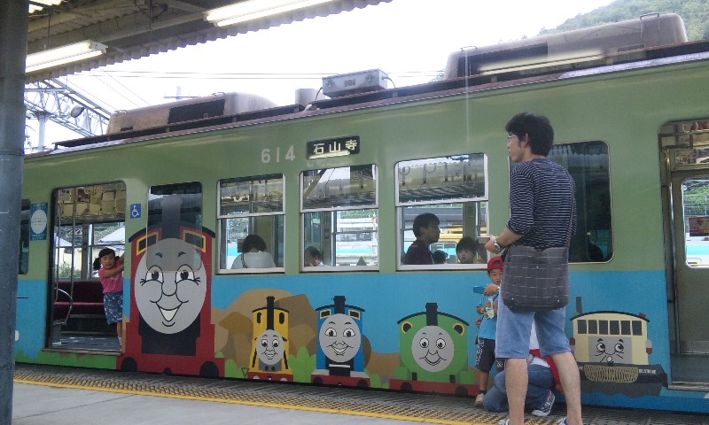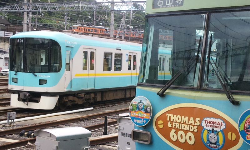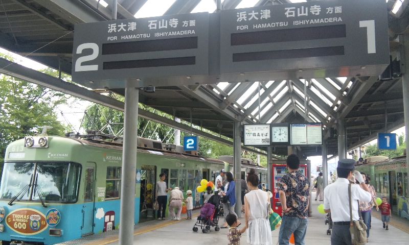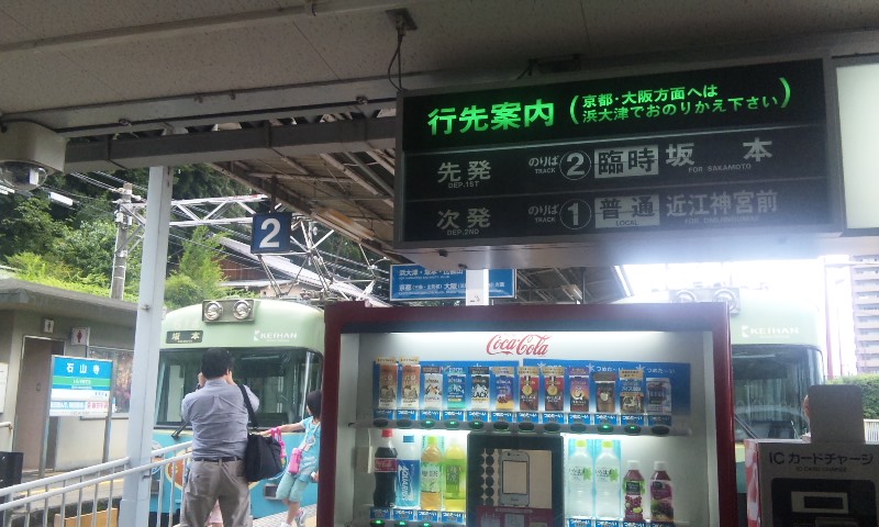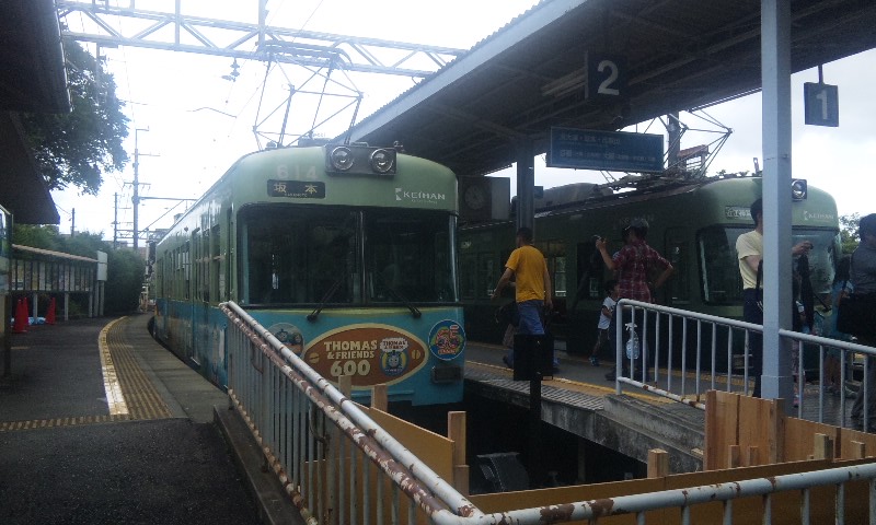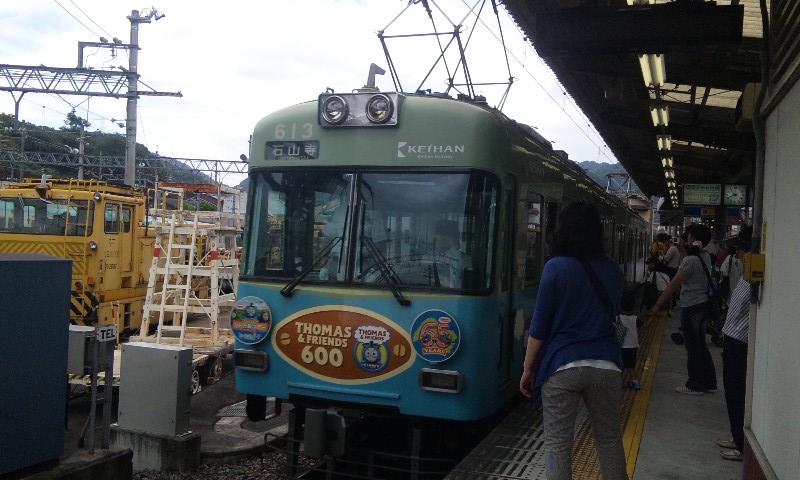 続きです。 浜大津駅が見えてくる直前のカーブ。 ここを走る800系、路面電車で4両編成ですので、とても強烈ですw 浜大津駅で結構のお客さんが下車。 後方展望ですが、それでも鉄道ファンや子連れの方が写真をパシャパシャ。 浜大津を過ぎていくとだいぶ人が少なくなりました。 車内は御覧の通り。 この日はちょうど梅雨の時期で、曇ったり雨が降ったりという不安定な時でしたが、 青空が顔を覗かせました。 雨男、kokucyouをもってしても雨が降らないのは、トーマス号の功績をたたえてか?? 京阪石山の手前ではJRとクロス。 221系が比較的綺麗に撮影できました(笑) 石山寺駅に着きました~。 早速、パタパタ式の発車標。 「臨時」出るんですね、ちょっとびっくりしました。 撮影される方もちらほらいますが、まばらで最終日とは思えない雰囲気。 これでトーマス号は石山寺駅に来るのが最後になるというのに…>< コカコーラの自販機と、撮影されている方が邪魔ですね…(爆) しかし、もうこんな風景も最初で最後でしょう。 (続く…)